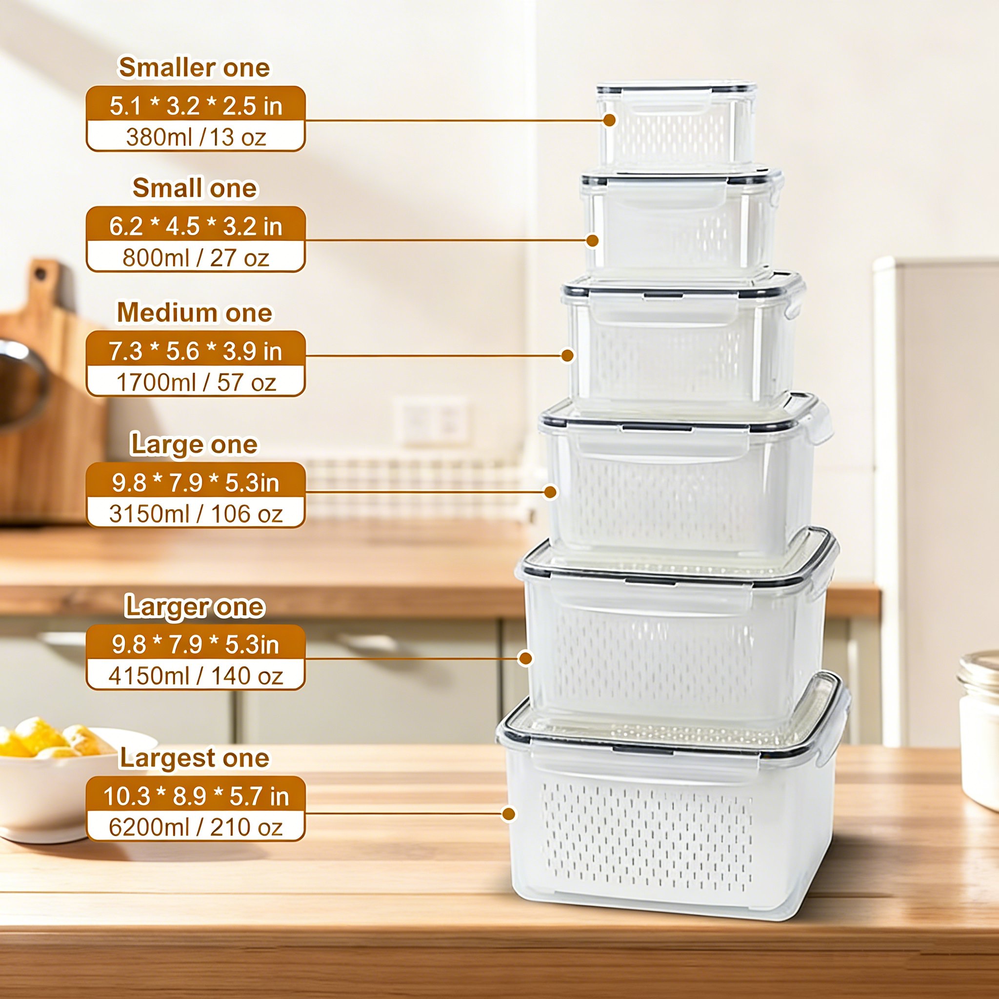 Individual Volume: Approx. 0.38/0.8/1.7/3.15/4.15/6.2 liters (varies by container)
